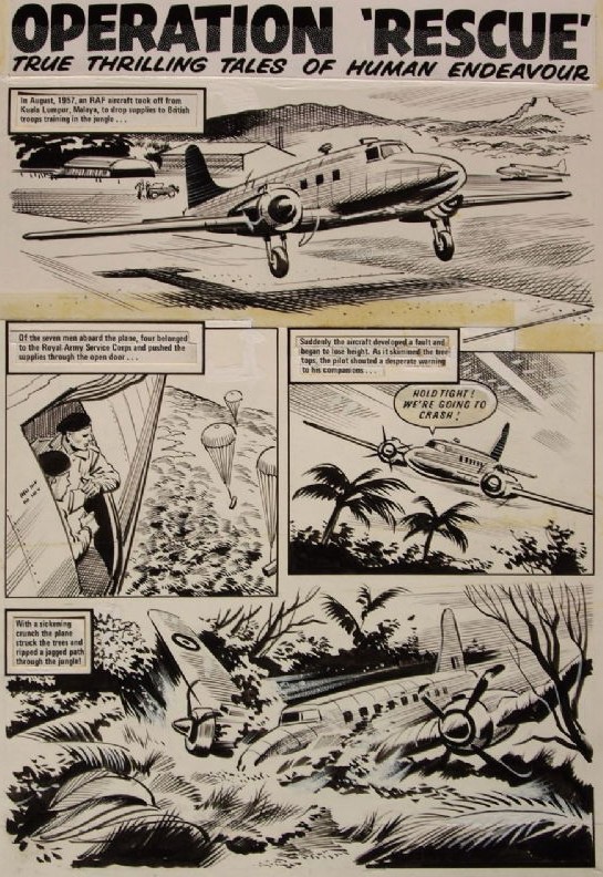 He was one of several artists providing illustrations for The Bible Story and Look and Learn magazines in the 1960s, illustrated text stories for both the Champion and Hurricane annuals, and drew for Lion, working on strips such as “Captain Condor” (including the story “The Hole in Space, published in 1965, reprinted in Spain by Ediciones Vertice in Galaxia Illustrada No. 13), and “Tales of Tollgate School”.