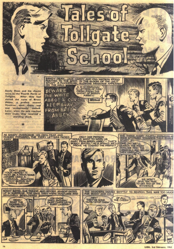 The art is believed to be the work of Selby William Donnison, born in Tynemouth, Northumberland the son of an advertising designer on 19th August 1921. Initially training as an electrician, he became book and illustrator, his comic credits including “The Four Marys” for Bunty and “Roy Race’s Schooldays” for Tiger in the 1980s (replaced on the latter by Richard Jennings).