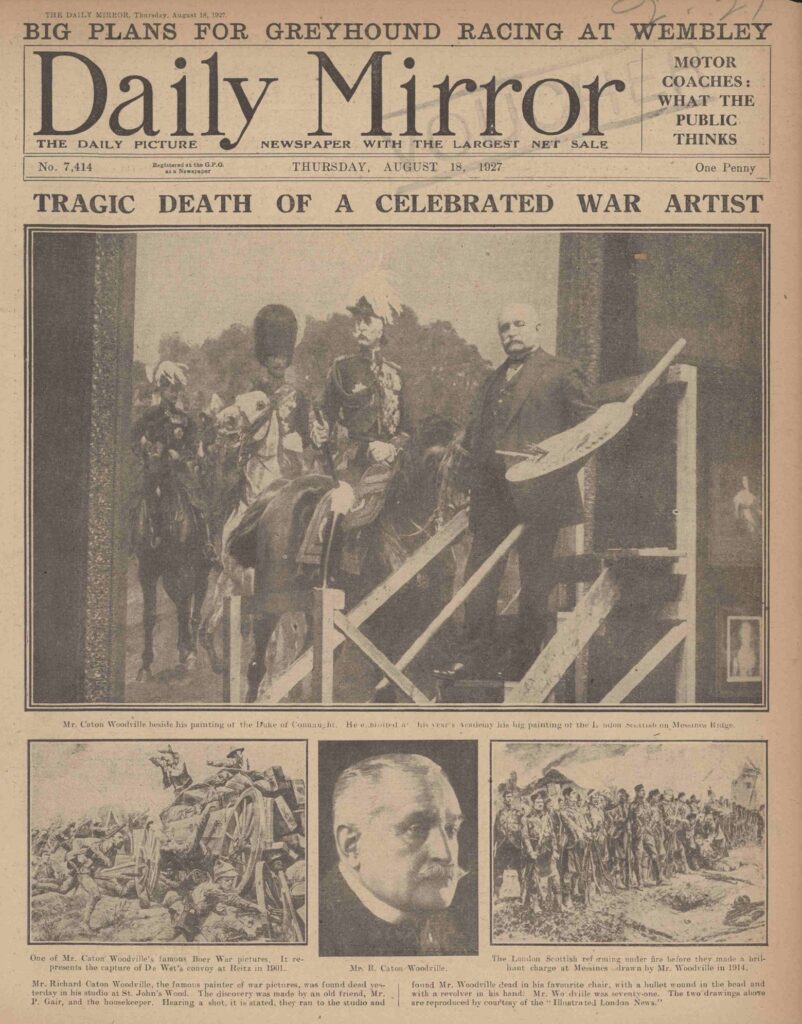 The Daily Mirror reported he had been happy the day before, noting his painting, “Stand of the London Scottish on Messines Ridge (now held by the London Scottish Regiment Museum Trust), had recently exhibited at the Royal Academy. But he had been suffering from heart trouble and pain from his leg, which he had broken years earlier and which had been aggravated by a second accident in Egypt. After such an active life, Woodville was worried that, at 71, already lame, that he would become an invalid.
