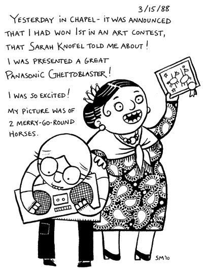Sarah: When I was about eight years old, I used to make a magazine called Family Favorite and leave it on my neighbours’ doorstep, ring the bell and run away. I think the first comics I ever made were for that magazine, and they were copied, possibly even traced, from Archie comics. But all the comics I ever read in the Seattle Times or Archie seemed to have funny punch lines, and I didn’t think I would ever be able to do that. And I read a few of my mother’s stashed-away story comics (Jack London’s White Fang, a couple fairy tales) but they were so old and brittle that I didn’t think people still made them. I didn’t even connect them as a storytelling medium with the funnies in the newspaper. In fact, the linework and colours looked so polished to me that I never even thought about real, live people making them at all. Maybe I thought they grew on trees or something.