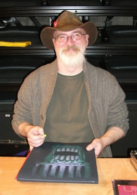 Colin MacNeil is a former student at Dundee University’s Duncan of Jordanstone College Of Art And Design where Phillip Vaughan lectures and supplied the rather excellent cover for Anthology One. As can be seen here, he uses chalks on a black background for his convention sketches.