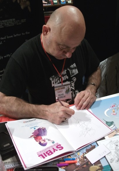French artist Michel Rodrigue is currently resident in Scotland and having been at the previous Hi-Ex was back this year on the Cinebook stand. His Cinebook titles are the two modern Clifton titles Jade and Black Moon which he was signing and sketching over the weekend. He is also the writer of the French series Sybil La Fee Cartable which is on its third book in France and the first book of which has just be translated into English by Papercutz as Sybil The Backpack Fairy and he was more than happy to sketch and sign copies of it as well.