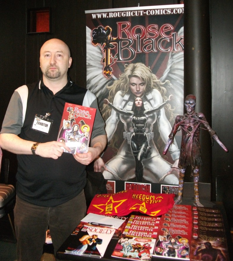 …while Ed Murphy of Rough Cut Comics had one of the most impressive of the small press displays showing off his comics The Freedom Collective, The Surgeon and Society: Party Animal as well has the impressive graphic novel Rose Black written by Tom Campbell, pencilled by Jaeson Finn and inked by Colin Barr.