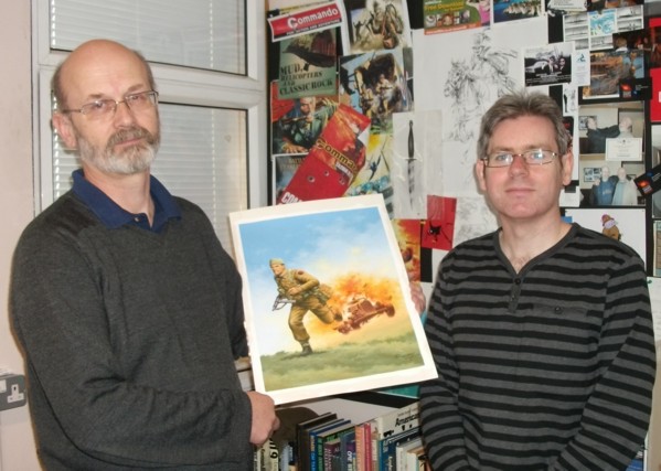 As the 50th anniversary year of the Eagle Award winning Commando continues apace, there are currently two different free Commando art exhibitions on in the UK. Dundee University has the Commando Battlelines exhibition while London’s National Army Museum has the Draw Your Weapons exhibition. Commando cover artist Ian Kennedy painted a special Commando image to promote the National Army Museum exhibition which has been used on all its advertising, including posters on the London Underground, and editor Calum Laird and chief-sub Scott Montgomery are shown above with Ian’s original artwork.