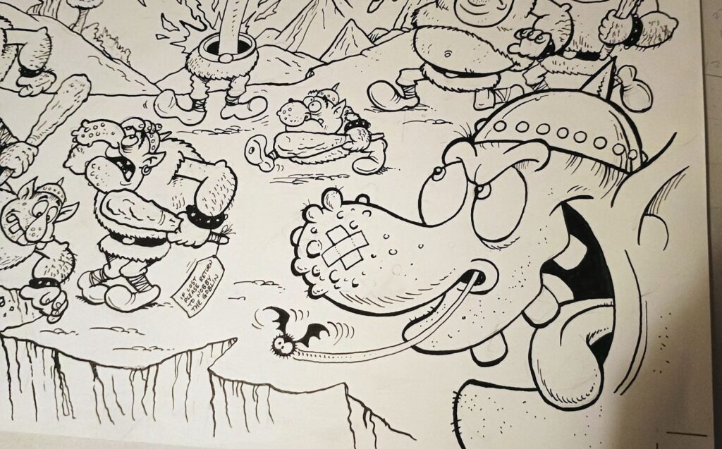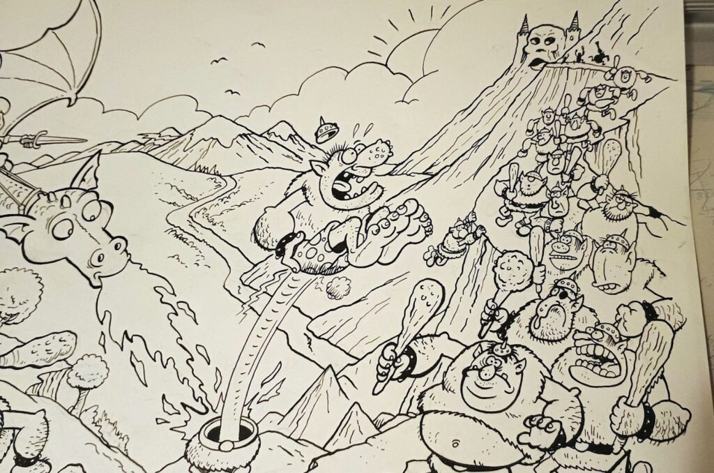 Large size original comic art featuring Goblins and Dragon by Lew Stringer from Know How magazine No.1, a two page spread published in 2002