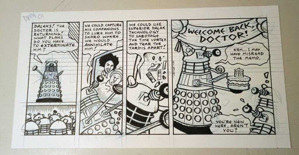 Ace cartoonist Lew Stringer’s latest art auction ends this Sunday, 18th January, and includes another marvellous “Daft Dimension” from Doctor Who Magazine featuring, of course, a daft Dalek!