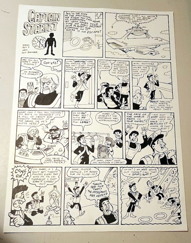 Also up for sale is a “Suicidal Syd” page from VIZ comic from 2009, a “Macho Man” strip he drew for Marvel UK’s Secret Wars comic back in 1986, a Captain Scarlet parody, probably for the humour title, UT, written by Kev F Sutherland and drawn by Lew from the 1990s, plus a page by the late great Jimmy Hansen that he drew in 1990 for Buster comic featuring the popular “Ricky Rainbow” character.