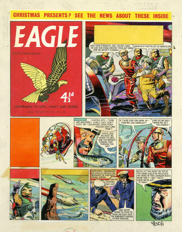 The art is a page from the story The Phantom Fleet, first published in Eagle 50 (volume 9) in 1950.