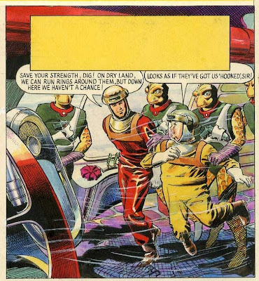 They find a fleet of huge alien craft containing peaceful aquatic creatures called Cosmobes who are fleeing from another aquatic race, the warlike Pescods, whose “Crimson Death” weapon destroys all metals on contact.
