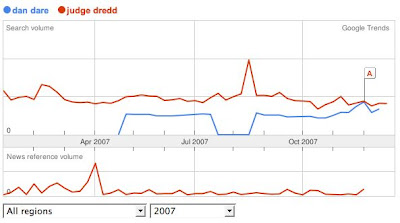 The results don’t indicate just how many searches have been analysed, but it does let you know from where searches have been taking place. The snapshot above compares 2007 searches for “Dan Dare” with 2000AD‘s “Judge Dredd” and you can see Virgin Comics PR machine played its part in boosting the space hero’s web popularity with launch of their new comic last month.