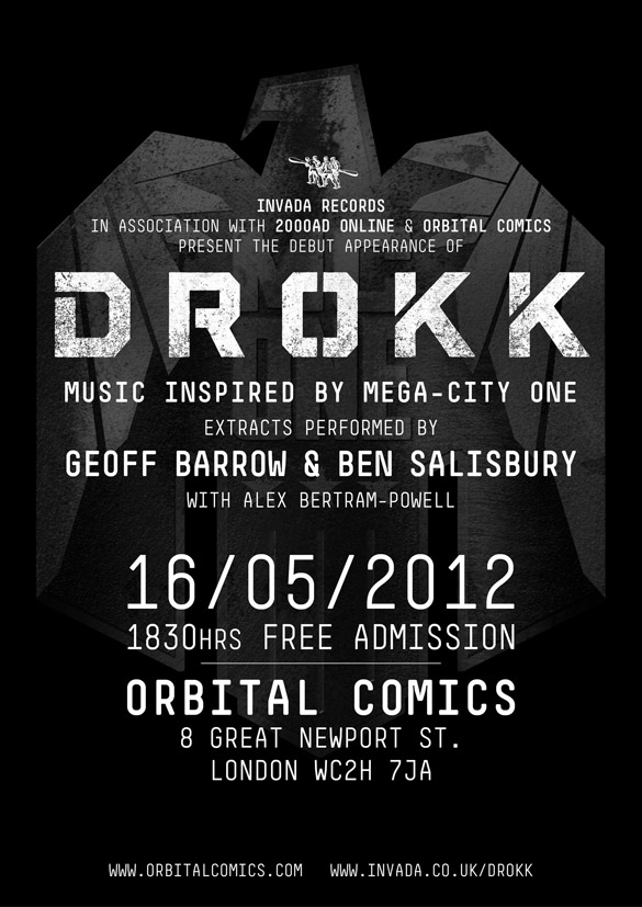 Geoff Barrow and Ben Salisbury will be performing extracts from the new record, Drokk – Music Inspired By Mega-City One, released on Invada UK, at Orbital Comics on the 16th May.