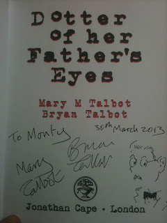 I eventually abandon my post to catch Mary and Bryan Talbot talk about their award winning graphic novel Dotter of my Father’s Eyes. This splendid work concerns the lives of Lucia Joyce and Mary Talbot in conflict with their respective fathers, drawing resonances and parallels between two time periods. The Dundee Uni crowd ask a number of intelligent questions. Consequently we learnt a lot about how Mary’s story emerged through research, dreams, intuition and hard work before Bryan brought the script to life in watercolour, pencil, ink and Photoshop.