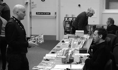 On arriving at my table it became clear that I was surrounded by Expo experts with banners and hoardings and plates of enticing cakes to attract a crowd. In contrast, my own self-published wares were meagre and rudimentary. A lot of guests sell comics, merchandise or do sketches for cash which is commendable. I’m frankly too unsure of myself for the latter, and there are technical issues with the former. I’ve got stuff in 2000AD and Clint this very month but I can’t very well sell that as both Rebellion and Mark Millar get annoyed when I post them coins through the post. I’m doing a six issue series – Death Sentence, with Mike Dowling – which Titan aren’t releasing until October so it’s too early to sell that. I decide the best thing is to do is get on with finishing the short story I’m drawing for 2000AD and chat to anyone that stops by.