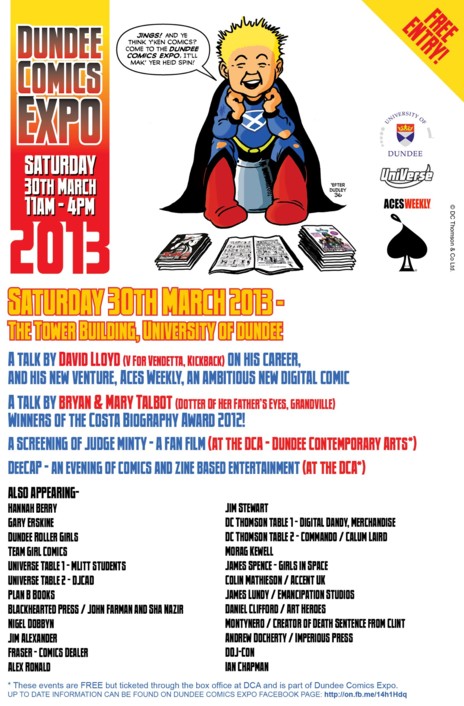 The first Dundee Comics Expo will be opening its doors to the public in two week’s time at 11am on Saturday 30 March 2013 and entry to all its talks, workshops and sales rooms will be free.