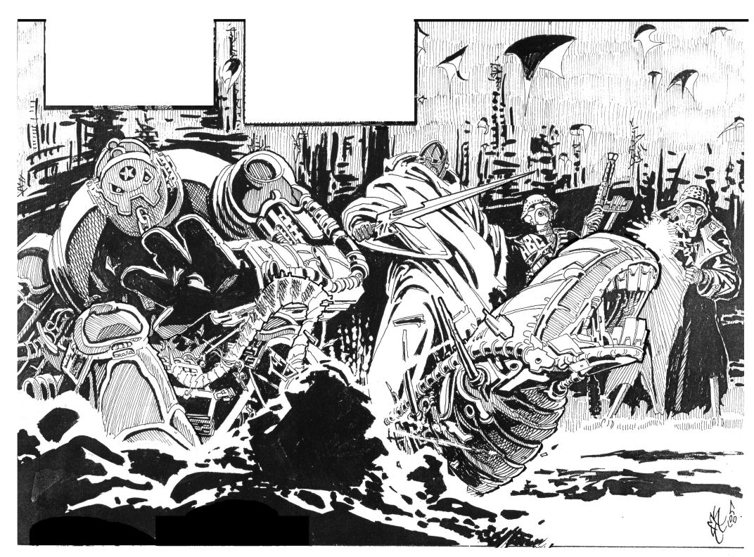 An unpublished panel from the ‘tryout’ strip Smuzz did for ABC Warriors