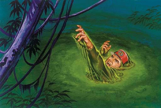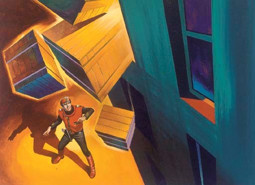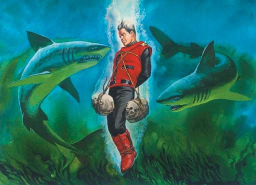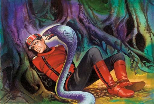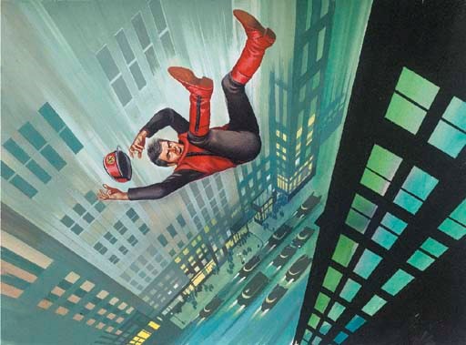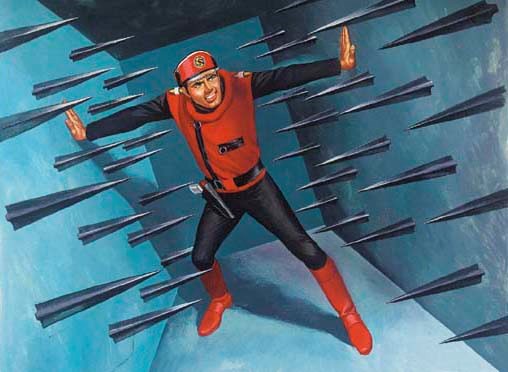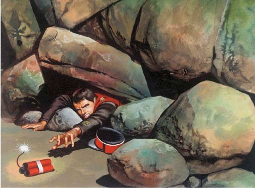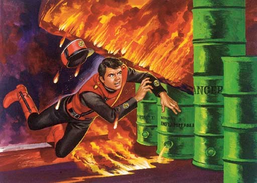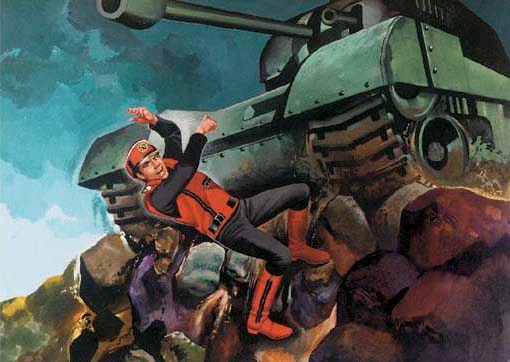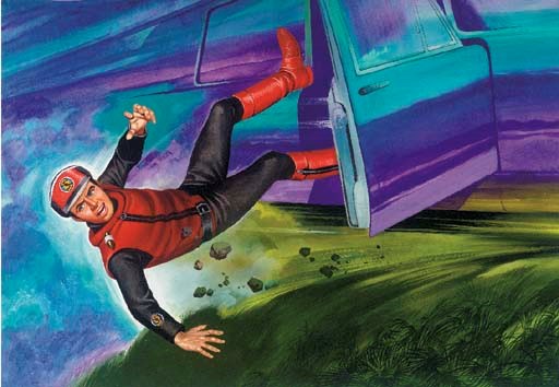 Following his impressive work on the “Stingray” comic strips for TV Century 21, Ron Embleton was invited by Gerry Anderson to provide artwork for the closing credits to Captain Scarlet and the Mysterons. Embleton’s ten pieces showed Captain Scarlet in various perilous situations, with this artwork being the fifth to appear in the sequence. A section of each image was also presented in close-up as part of the sequence.