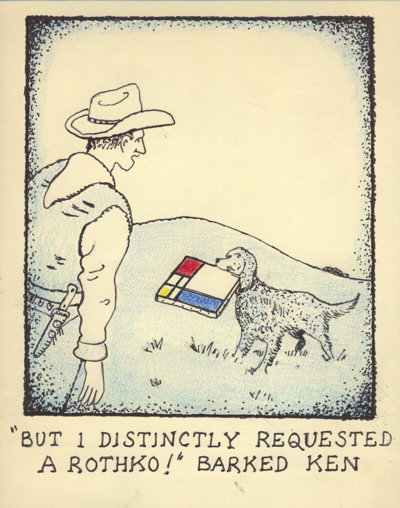 Deriving material from varied sources such as pulp fiction, adventure stories, cowboys, objects and foodstuffs with names that he found intriguing, Baxter worked with a number of recurring personas who contemplate life’s big and small questions in incongruous scenarios at once familiar and surreal, including the great outdoors, art galleries, and the dinner table.