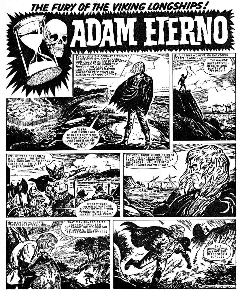 His many British comics credits included Battler Britton for Thriller Picture Library, Galaxus: The Thing from Outer Space and Pete’s Pocket Army for Buster, Janus Stark for Smash and Valiant, Kelly’s Eye for Knockout and Valiant), Raven on the Wing for Valiant, Adam Eterno for Thunder and Lion and much more. (DanDare.info has a full listing of his British credits).