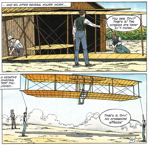 Cinebook Recounts The Wright Brothers is not an action packed tale of daring pilots but it is a detailed and well illustrated account of the logical design steps of two engineers that lead up to a moment in history – and that is what makes it worth reading.
