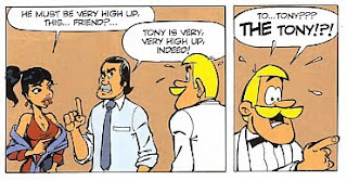Originally published in 2004 as the 19th Clifton album Lune Noire, Black Moon continues de Groot’s look at the British from the opposite side of the Channel. The most obvious digs at British sensibilities are the two British agents already undercover in North Korea, known as Fish and Chips. Their politeness and unflappability are rather taken to the extreme, while Clifton and Jade’s target is described to them as “Tony’s nephew”. The young readers of the book will not get the reference but with Rodrigue drawing him as a caricature of a young Tony Blair, older readers will.