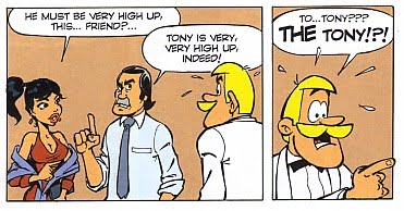 Originally published in 2004 as the 19th Clifton album Lune Noire, Black Moon continues de Groot’s look at the British from the opposite side of the Channel. The most obvious digs at British sensibilities are the two British agents already undercover in North Korea, known as Fish and Chips. Their politeness and unflappability are rather taken to the extreme, while Clifton and Jade’s target is described to them as “Tony’s nephew”. The young readers of the book will not get the reference but with Rodrigue drawing him as a caricature of a young Tony Blair, older readers will.