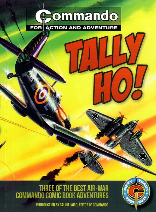 After fifty years of publication Commando has quite possibly had its highest public profile ever over the last few years due largely to the success of the large flexi-covered reprint books published by Carlton. These shelf bending doorstops contain 10 to 12 different complete Commando stories along with B&W versions of their covers plus introductions from past and present Commando editors and they present the artwork 25% larger than the original comic publication. The first of these was Command: Dirty Dozen which went, very unusually for a British graphic novel, to multiple reprints plus a re-covered, and partially retitled, bargain version and even a Book Club Associates softcover edition. While these big reprints continue with the recently released Commando: Rogue Raiders, Carlton have now introduced a smaller and more price friendly range of Commando reprint books which includes Commando: Tally Ho!