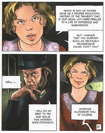 The plot is complemented by Ocano’s moody artwork which, along with Bellaoui’s sensitively dark colours, make for a book that impresses at first glance before even reading any of the text. However it is worth pointing out that Cinebook list it as a 15+ title and it is certainly a graphically gruesome book dwelling as it does on the remnants of the creature’s victims as Darwin and Miss Dickinson discuss the case.