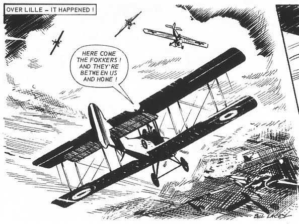 The book begins with a six page feature article setting the scene of both the beginnings of the Royal Flying Corps and the Great War itself. In the interests of transparency Bear Alley Books publisher Steve Holland asked me, as the resident aviation enthusiast, to proof read an earlier version of this article for accuracy and it was indeed accurate giving more than enough background for readers to appreciate the subtleties of what the characters were experiencing in those early years of the war before the conflict settled into the more familiar format of trench warfare. Indeed my main comment then was that the article focused on the historical side of the comic strip rather than on its creators but with Volumes 2 and 3 to come in June and July 2011, Steve assured me that both Butterworth and Lacey would each receive feature articles in them. Rather than reusing frames from the story, Steve uses WWI aviation illustrations from Look and Learn painted by Wilf Hardy to liberally illustrate the feature while the book’s cover is a dynamic WWI scene featuring Brisfit fighters painted by Graham Coton since Bill Lacy was never given the chance to illustrate Eagles for the cover of the weekly magazine.