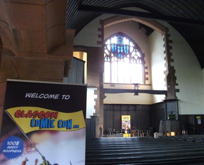 It was set in the deconsecrated Queen’s Cross church which was designed by noted Scots architect Charles Rennie Mackintosh and, though less than imposing on the outside, the church proved to be imposing on the inside as demonstrated by the number of wide mouthed looks from attendees as they entered. The main church had wooden pews a plenty for the attendees to see the stage which was set in the old Chancel area behind the Rood Beam and all the guests and organisers managed to avoid the temptation to go into the pulpit. The back of the church had tables for small press and some artists while the majority of the dealers tables and the rest of the artists were in the small church hall at the rear of the building. The long narrow room of the building’s library was also used to squeeze in some more small press tables.