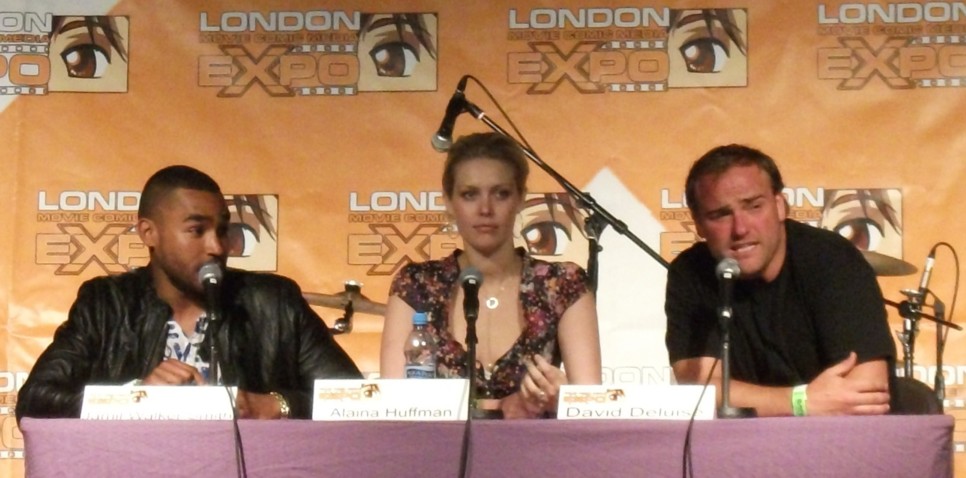 One large corner took in the main stage with plenty of chairs and an impressive audio visual suite where the main panels and the live Japanese pop music took place. After various people from Caprica, Fringe and BBC’s Merlin on the Saturday, Sunday also saw the team from BBC3’s medical horror Pulse including writer Paul Cornell (above) and Stargate Universe’s Alaina Huffman (medic TJ) and the irrepressible Jamil Walker Smith (Sgt Greer) plus SG1’s David DeLuise (below).