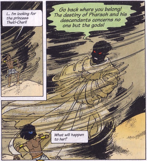 With the Sphinx having Theti-Cheri in his grip, the story is really a quest tale as Papyrus overcomes various problems to get to the island of the gods and back again within the same day. These problems range from Anty the ferry boat/man/dragon, a hallucinogenic castle, a trip to the modern day ruins of the temple of Amon, as well as the bickering triplets who should be keeping the Sphinx free of the sands that are blown over it by the human sand storm.