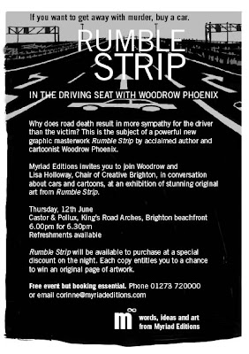 If you want to get away with murder, buy a car. That could easily be the “message” of Woodrow Phoenix’ latest graphic novel, Rumble Strip – except that of course, the reality is never that simple. The truth is far more complex and, as Woodrow outlines our increasingly dangerous relationship with cars, deeply disturbing.
