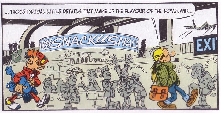 Yet there is certainly more going on with the book than just the story. The girl reporter who accompanies our two heroes to Australia is called Cellophine in the Cinebook version while her original French name is Seccotine. Seccotine is a French brand of glue that has become a byword for a person who is too clingy, so her translated name of Cellophine is a play on cellophane wrap which is also known as cling film. This and a selection of the Aboriginal names for people and places introduces word play similar to that used in the character names in the English language Asterix books. In addition to this the flight that the three main characters take to Australia is 714. That is the flight number of the plane that Tintin misses in the book that we know as Flight 714 but the full translated title of which should be ‘Flight 714 to Sydney’. These little touches enhance the Spirou book.