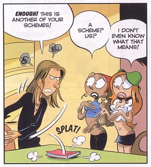 The Bellybuttons tells of the lives and loves of three high school girls – the glamorous but conniving Vicky and Jenny and the plain and very put upon Karine. Indeed the cover of It’s Ugly Out There, of Karine carrying a umbrella for the other two while she herself gets wet, rather sums up the relationship between the three. While both Vicky and Jenny try to be the most glamorous and desirable girl at school and vie for the attention of the older motorbike riding, and perpetually helmeted, John John, Karine acts as their skivvy until she finds love with the rather more sensible Dan. However as the other two realise that they are losing Karine to a boyfriend that they encouraged her to talk to in the first place, they plot to end Karine and Dan’s relationship.