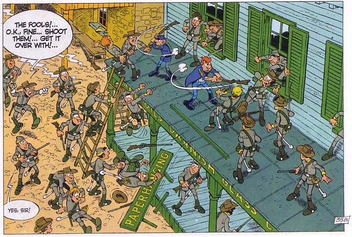 My initial reaction to The Bluecoats back in 2010 with The Skyriders was lukewarm when I didn’t really take to the mixture of combat and humour. However this is the third Bluecoats that I have now read and I am starting to come round to this series. I never had a problem with Lambil’s artwork which is fun when it needs to be and his splash panels here show off a remarkable number of characters as the two sides’ troops clash in the main street of the town.