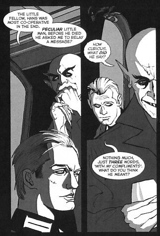James Devlin’s moody cover with its subdued colours stands out while his internal artwork is in greyscale which suits the 1930s horror movie feel of the book very well indeed. There is little grandstanding inside with the few splash panels used to good effect as the art gets on with telling the story while the action sequences skew their panels and most pages have black gutters just to add to the overall effect.