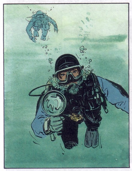 With XIII and Jones diving into the reservoir in scuba gear, artist William Vance gives readers five consecutive pages of silent underwater panels as our heroes search for the submerged church and then battle the US agents sent to kill them. With only two speech bubbles with question marks in them, those five pages tell the story of the search and battle remarkably well and are a highlight of the book.