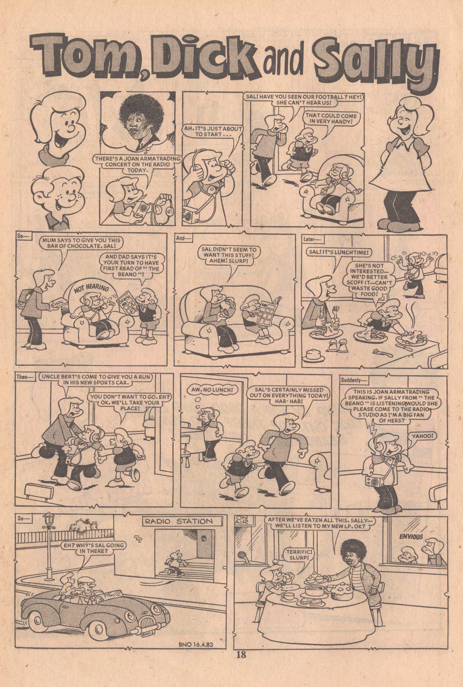 Some downthetubes readers may have seen three-times Grammy nominated British singer Joan Armatrading recently enthusing about The Beano in The Guardian, an interview tying in with the launch of her new album, How Did This Happen And What Does It Now Mean. So we thought we’d take a look at her guest story appearance in “Tom, Dick and Sally”, from The Beano No. 2126, cover dated 16th April 1983.