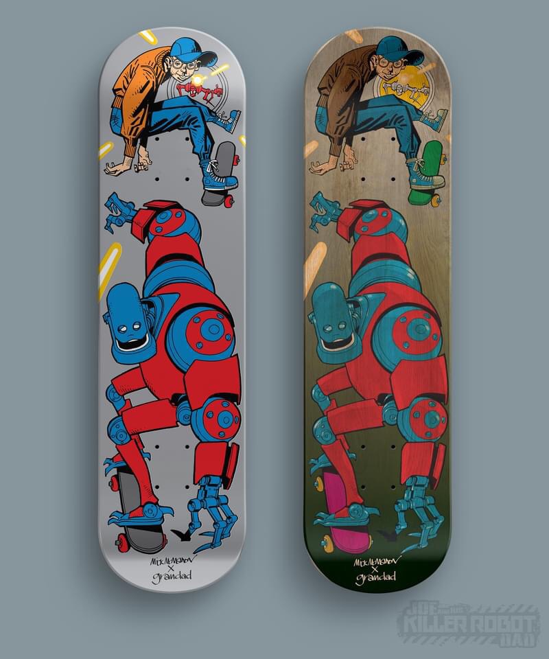 With specially created Joe and His Killer Robot artwork by Mick McMahon, these cool decks are available in full colour and screen printed (for the purists) variants. Check out Grandadskateboards.com to purchase!