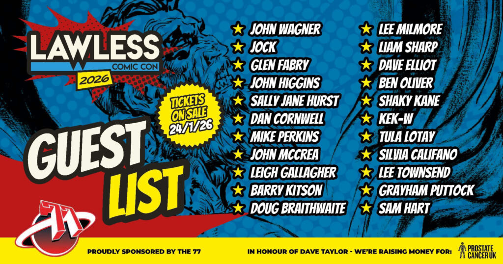 Lawless, the 2000AD-inspired fan run convention returning to 9th – 10th May 2026 to Doubletree by Hilton Hotel, Bristol, has announced its guest list – and what a Christmas present it is.