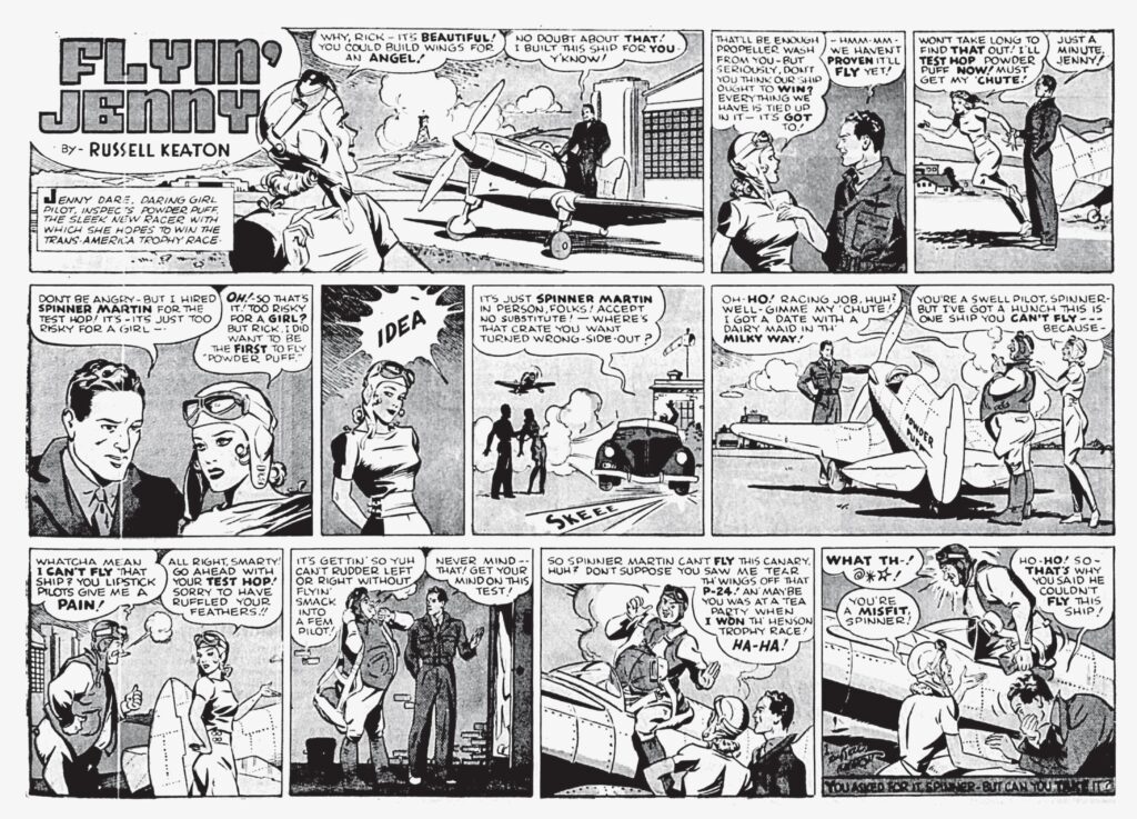Lambiek notes Russell Keaton’s many credits include the Buck Rogers‘ Sunday page from 1930 to 1933. He created Flyin’ Jenny for the Bell Syndicate in 1939 after gaining his pilot’s licence, later handing over the writing of the strip to writer Frank Wead and artist Glen Chaffin. In 1943, when he became a full-time flying instructor, he turned the art duties of the strip over to his assistant Marc Swayze.