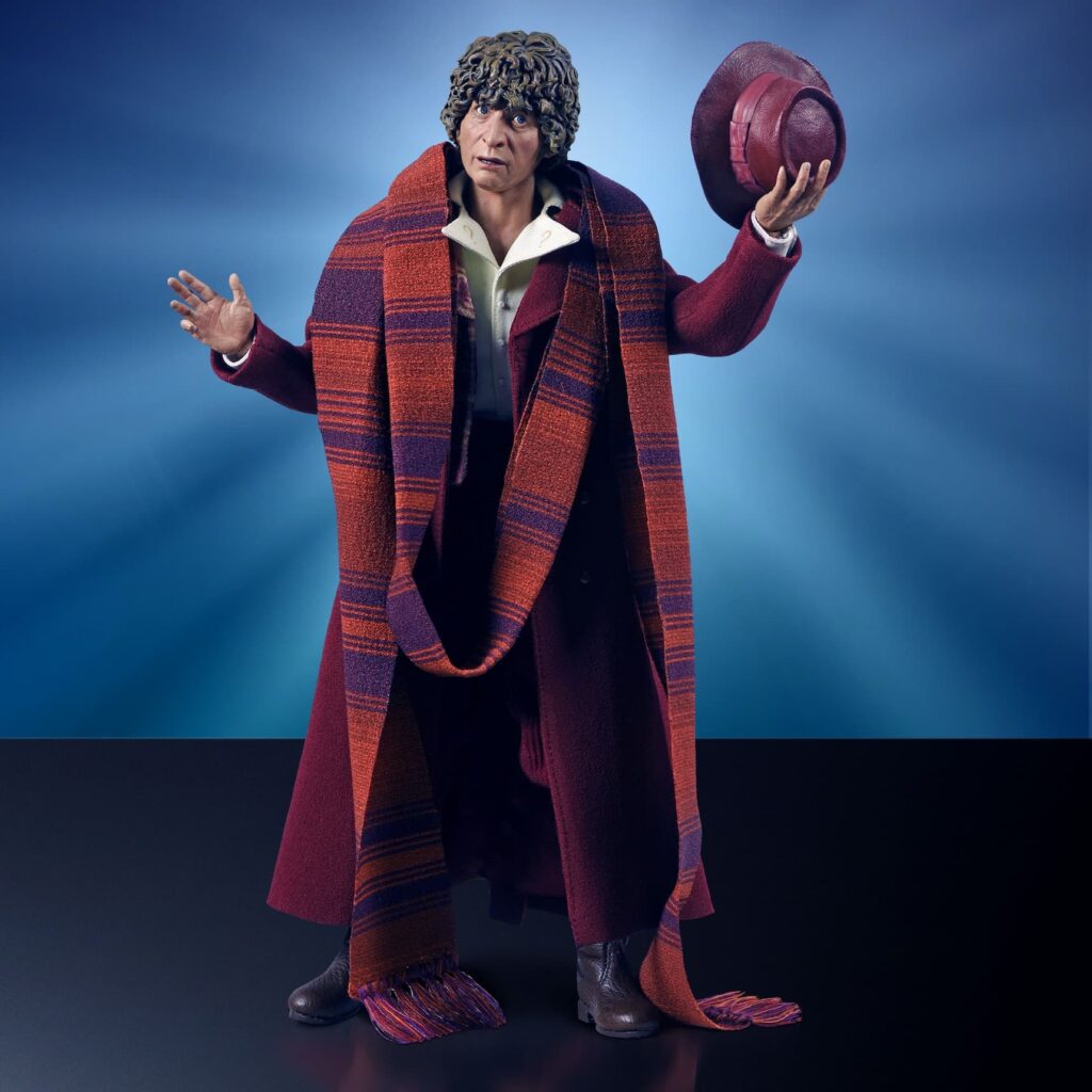 The figure shows the Doctor dressed in an open-necked shirt, a pair of breeches with braces, and has a removable waistcoat, calf-length cavalry overcoat and, of course, his famous scarf. He comes with multiple accessories, including two versions of the sonic screwdriver, a telescope, and a bag of jelly babies. The figure comes with a display base.