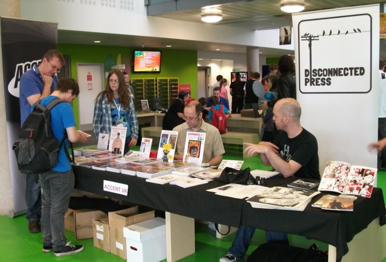 Manchester’s Accent UK were sharing one of the long bench tables with Disconnected Press. Disconnected had copies of Disconnected Volume 1 plus the last few copies of their Lost Boys title along with artwork from Conor Boyle who took part in one of the talks during the afternoon. There are more details of Disconnected Press on their blog.