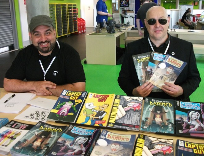 Glasgow’s Black Hearted Press(above), who also run the Glasgow Comics Convention and one of the two sets of Glasgow comic marts, were represented by writer/artist Sha Nasir (left) who was sketching a selection of his Laptop Guy characters and School Of The Damned writer John Farman (right). As well as selling all their current titles they also ran a comics workshop during the course of the day. Black Hearted Press’ website is here and the new School of the Damned website is here.