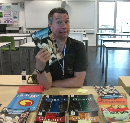 Writer Jim Alexander has worked on the Judge Dredd Megazine, DC’s Birds of Prey and Tokyopop’s Star Trek Manga as well as small press comics such as Gabriel for Glasgow’s Black Hearted Press and Amongst The Stars for his own newly started imprint Planet Jimbot and he had a selection of titles with him for sale. Jim’s blog is here, the Planet Jimbot Facebook page is here and he was interviewed on downthetubes here.