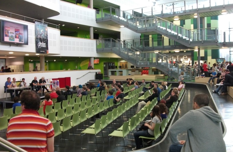 MegaCon took place on the ground floor atrium of the building and on entering it felt like walking into a big new theatre complex or music venue such as The Sage in Gateshead rather than a local school. Lots of space, multiple levels with stairs and bridges between them, lots of windows allowing in the sunshine, a tuck shop in the corner that looked more like a modern coffee shop, a sunken area with a stage and full of chairs for the talks plus, on the walls, there were large TV monitor screens with the event’s schedule details on them for all to easily read.