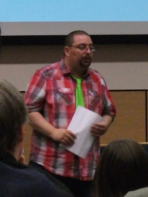 Run by Dr Chris Murray of the University’s Humanities department, each Comics Day has a theme and this year’s was Creating Comics, from writing and illustrating, via editing and designing, through to publishing. As well as organising the Comics Day, Chris is co-editor, along with Julia Round of Bournemouth University, of the new academic journal Studies In Comics and free copies of the first issue of this 186 page, oversized A5, landscape magazine were available to those attendees who were interested. The first issue is also available free online from its publishers, Intellect Books. Those of us who have been to many of Chris’ events in the past are aware of his line in sartorial elegance and this year he didn’t disappoint with a day-glo green tie against a red shirt.