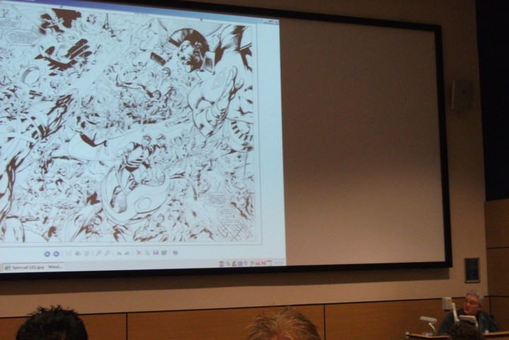 Marvelman and Excalibur artist Alan Davis was next with a heavily illustrated talk on how he creates a page of comic art from the initial thumb nail sketches, through pencilling and inking to the final coloured product. He explained how he saw some pages as being ‘silent’ despite them having text boxes and speech balloons because the artwork was enough to explain the story of the page, compared to those pages that needed the text for the reader to understand what was happening. As a superhero artist he explained why he believed in “swoosh” lines to indicate movement and how they could be incorporated without being overly distracting by drawing the character’s anatomy around the movement lines. Since Alan chose to sit at the lecturers desk at the front of the large lecture theatre there was no distraction of him walking around as he presented page after page of his superb art to the rapt audience and I’m sure that I wasn’t the only one with a pang of disappointment when he announced that he had reached his final page. Questions for Alan followed before a break during which there was a signing session in the Tower Building’s reception area by Rian and Alan.