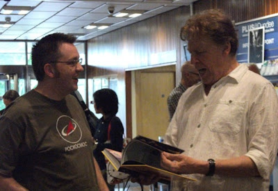 The day closed with a popular signing session in the reception area from Pat, Dez and Nana. One of the strengths of Dundee is the friendly atmosphere that exists outside the main lecture theatre with sales tables, exhibitions and refreshments all in the same area and the willingness of the guests to stand and chat to the attendees as well as to sign items outside of the slightly more formal signing sessions. Indeed where else could you talk to the editor of Warlord having just spoken to the editor of Battle or, as below, see the current Tharg’s newest artdroid, Graeme Neil Reid, share a joke with the original Tharg, Pat Mills.