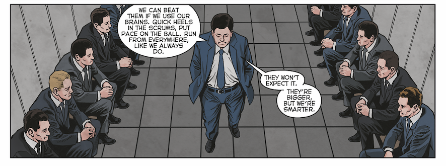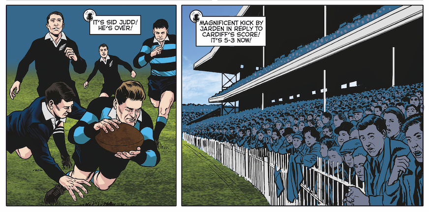 Released last year, and still available is Bleddyn, co-written by East Terrace editor and rugby author James Stafford, tellsing the story of Cardiff’s famous 8-3 triumph over the fourth All Blacks in 1953. Bleddyn was co-written with Steve Coombs (DC Thomson), drawn by Gary Erskine (Marvel, DC, Vertigo) and lettered by Rob Jones (Image Comics, Penguin, DC Thomson).